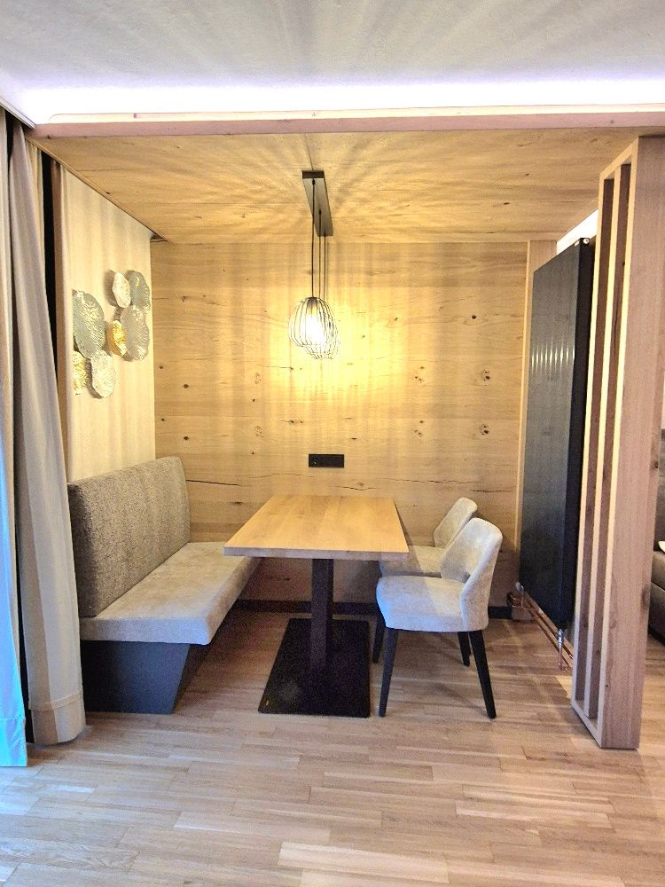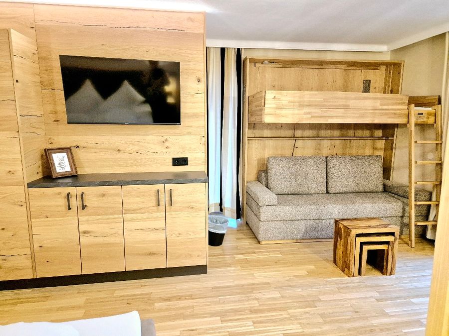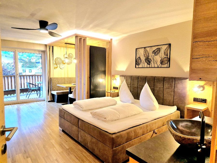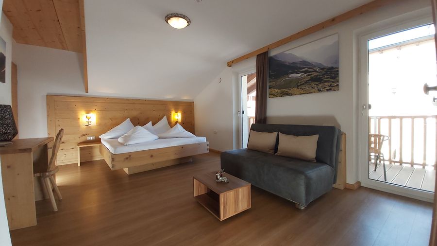 Mehr Raum für Paare, Familien oder Freunde: Die Adler Junior Suite bietet ein separates Wohngefühl mit großzügigem Balkon und traumhaftem Blick auf den Berg Schlick. Standard für 2 Personen – bei 3–4 Personen sorgt die komfortable Schlafcouch für zusätzliche Schlafplätze.