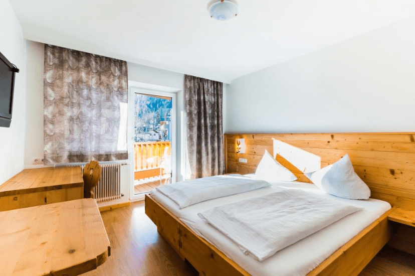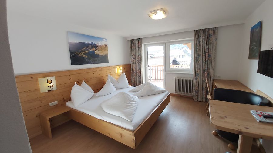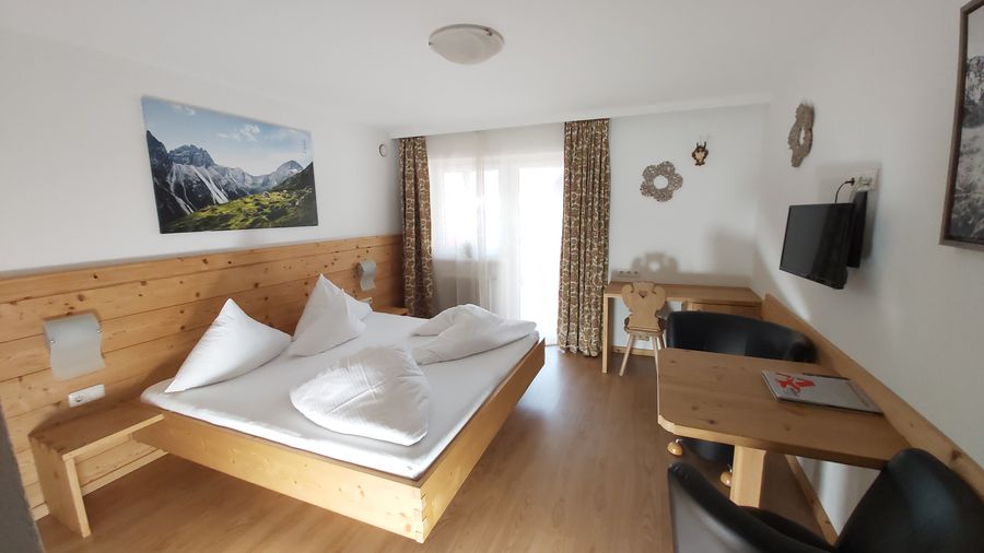 Unsere hellen Doppelzimmer verbinden modernen Komfort mit natürlichen Materialien und tirolerischer Wärme. Vom eigenen Balkon aus genießen Sie den traumhaften Blick auf den Berg Schlick und die umliegende Bergwelt.